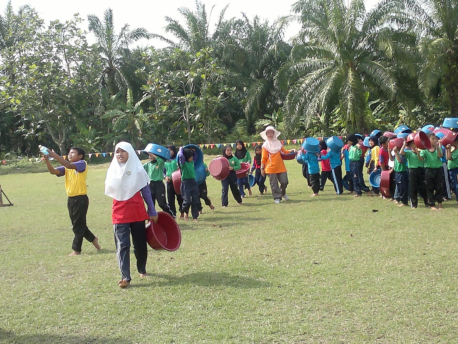 Selepas itu, kami sempat bergambar dan kemudian diadakan acara permainan bagi guru lelaki dan perempuan. Biasalah guru lelaki dengan bola sepaknya dan guru perempuan dengan sukaneka. Oleh kerana aku lebih kepada guru perempuan , maka ku rakamkan acara ini. Antaranya, bolinh kelapa, bola beracun dan menjaringkan bola yang ada air ke dalam gol (tudung) yang dipegang oleh dua orang guru.